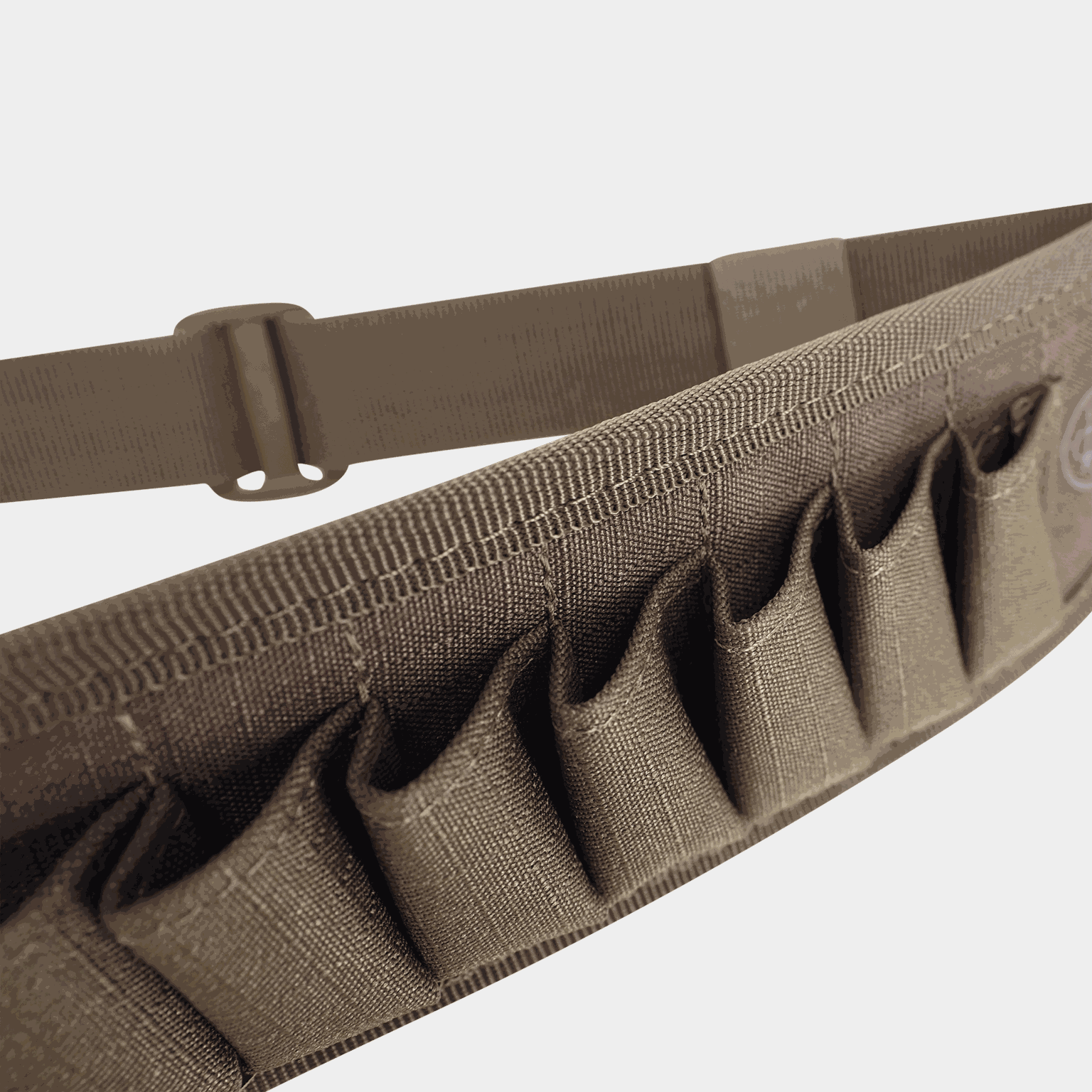 Justerbart patronbälte för hagelgevär, som rymmer 20 hagelpatroner i kaliber 12. Tillverkad av slitstark polyester. Vadderat på framsidan.